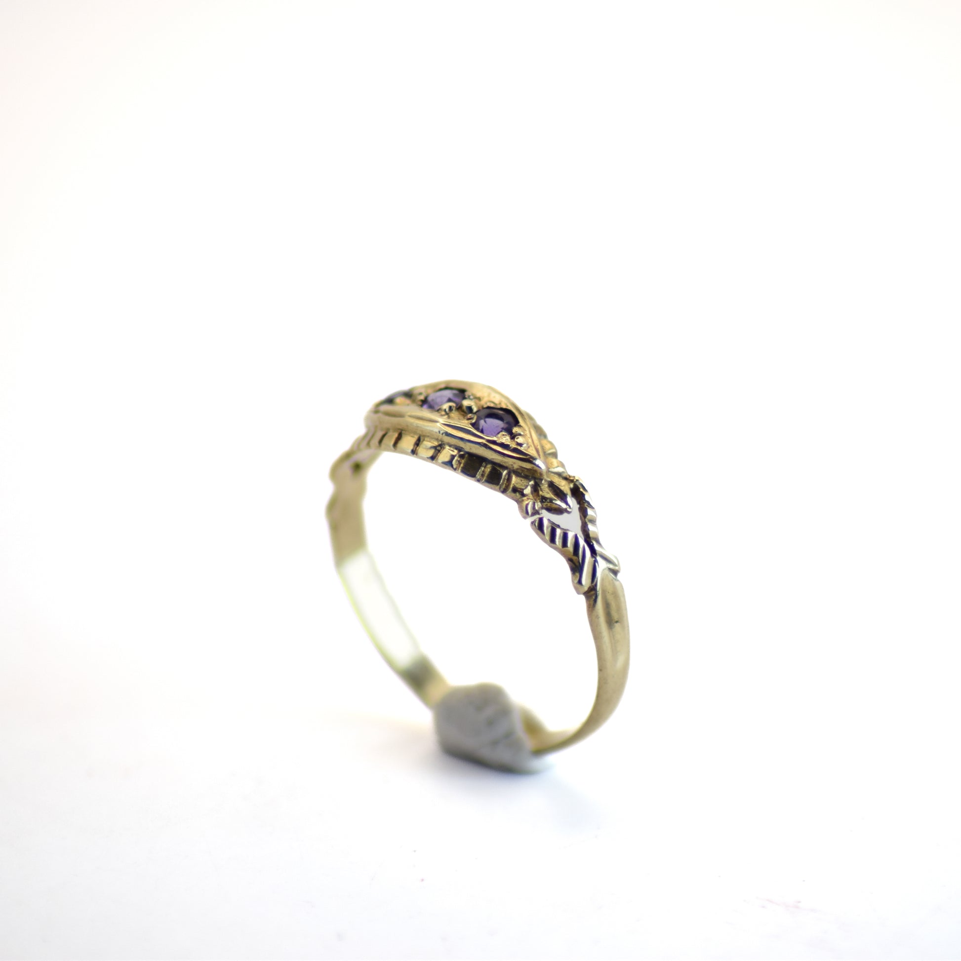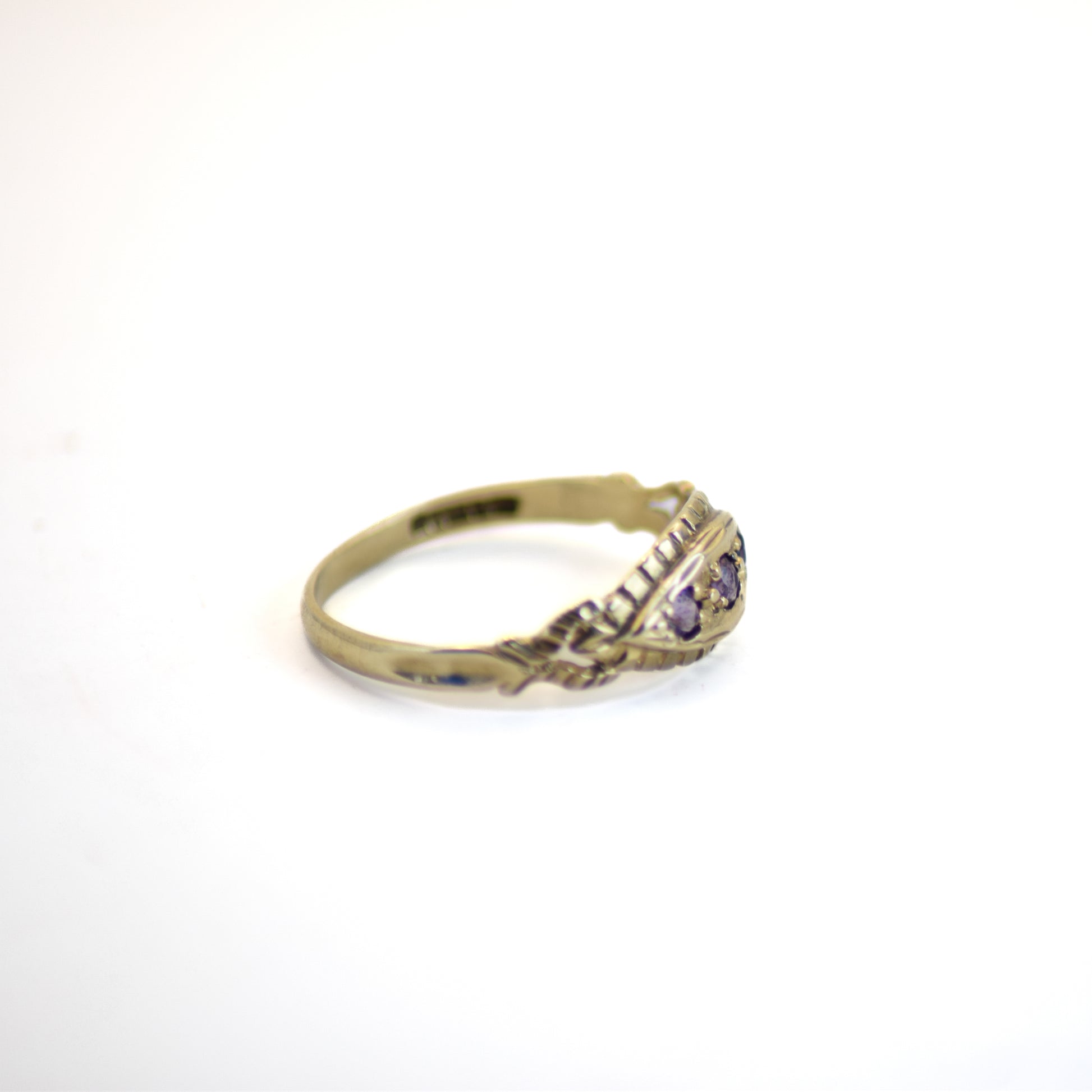 3 stone amethyst 9ct gold boat ring. Slight damage in band, price reflected.